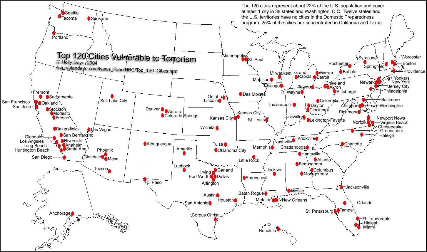 DEYO NOTE: This list is not tied to military bases. Target factors could include population density, landmark-cultural-heritage centers, proximity to nuclear plants or NBC waste sites, its importance as a shipping / trucking route/port, type of industry performed in the area, dams, communications hubs and other critical infrastructure sites, plus a variety of other considerations not included here.