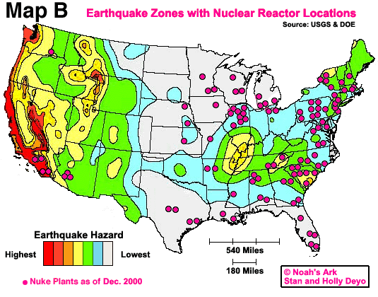 | If there were ever a clearly inadvisable place to live, it would be near a nuclear plant parked over an earthquake zone and downwind of prevailing winds from that area! The following two locator maps are from different sources and show virtually the same areas occupied by nuclear plants. The maps are generally the same except Map B shows 6 now retired facilities. There are currently 104 licensed, operating nuclear power plants in the United States (69 Pressurized Water Reactors [PWRs] and 35 [Boiling Water Reactors] BWRs), which generate about 20% of our nation's electrical use. Map B also includes general and known earthquake zones. Map A is from the NRC. Don't panic if it appears you are sitting on one. Check out the area in question yourself, but this will give you an idea, plotted along with the earthquake zones, where are the less clever places to live. |