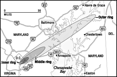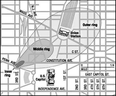 The contamination area depicted here is based on using 10 pounds of TNT and only a pea-size bit of cesium-137 which could be found in a medical guage. Initial casualties are limited to the site of the explosion. Assuming 30 years' exposure: Inner ring: 1 cancer death per 100. Middle ring: 1 cancer death per 1000. Outer ring: 1 cancer death per 10,000. |